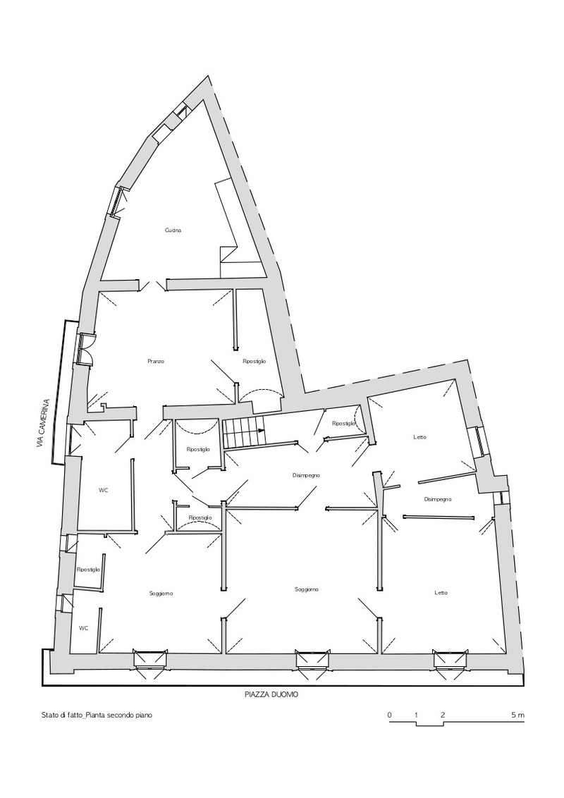 Per le unità che affacciano direttamente su Piazza Duomo, il concetto di base è stato quello della conservazione dei materiali esistenti, che sono stati quindi riproposti in maniera pressoché integrale. I pavimenti in graniglia di marmo e cementine e la pietra pece delle scale di collegamento sono stati accuratamente preservati. Il pavimento in maiolica è stato integralmente conservato e restaurato, infatti le poche mattonelle mancanti sono state abilmente sostituite con pezzi di nuova fattura, realizzate in maniera magistrale dagli artigiani locali.